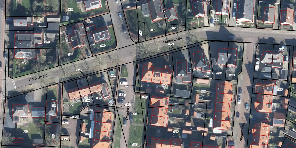 Het perceel waarop Dorpsstraat 8 staat heeft een oppervlakte van 1969 m². Dit is een zeer groot perceel. De perceeloppervlakte wordt geregistreerd door het Kadaster. Gedetailleerde informatie over de maten van dit perceel kunt u vinden in het rapport Kadastrale kaart met maatvoering van Dorpsstraat 8.