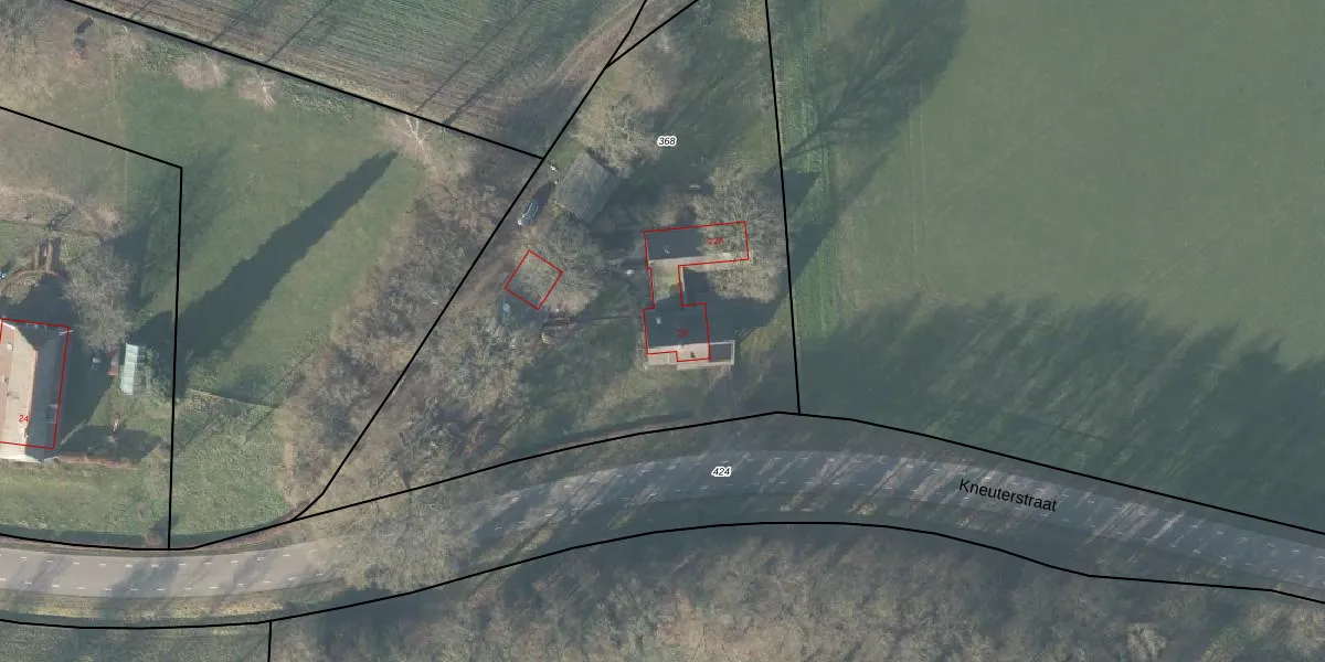 Kneuterstraat 22 is gelegen op kadastraal perceel VOO00R368. Deze kadastrale aanduiding is uniek en wordt gebruikt door het Kadaster om eigendomsrechten en andere zakelijke rechten vast te leggen. Het perceel maakt onderdeel uit van de kadastrale gemeente Voorst.