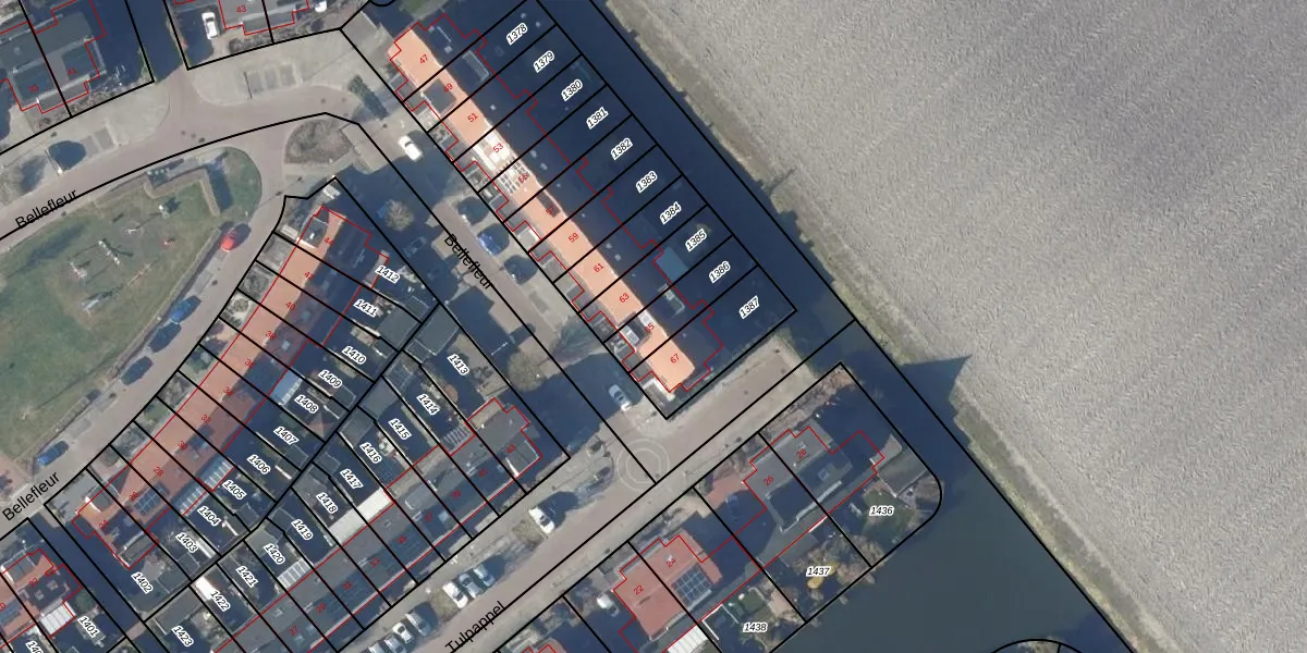 Het perceel waarop Bellefleur 65 staat heeft een oppervlakte van 155 m². Dit is een middelgroot perceel. De perceeloppervlakte wordt geregistreerd door het Kadaster. Gedetailleerde informatie over de maten van dit perceel kunt u vinden in het rapport Kadastrale kaart met maatvoering van Bellefleur 65.