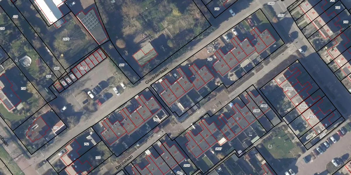 Het perceel waarop Gladiolenlaan 16 staat heeft een oppervlakte van 1862 m². Dit is een zeer groot perceel. De perceeloppervlakte wordt geregistreerd door het Kadaster. Gedetailleerde informatie over de maten van dit perceel kunt u vinden in het rapport Kadastrale kaart met maatvoering van Gladiolenlaan 16.