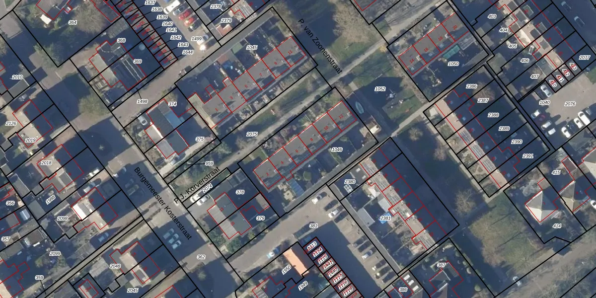 Het perceel waarop P.J. Korverstraat 6 staat heeft een oppervlakte van 975 m². Dit is een groot perceel. De perceeloppervlakte wordt geregistreerd door het Kadaster. Gedetailleerde informatie over de maten van dit perceel kunt u vinden in het rapport Kadastrale kaart met maatvoering van P.J. Korverstraat 6.