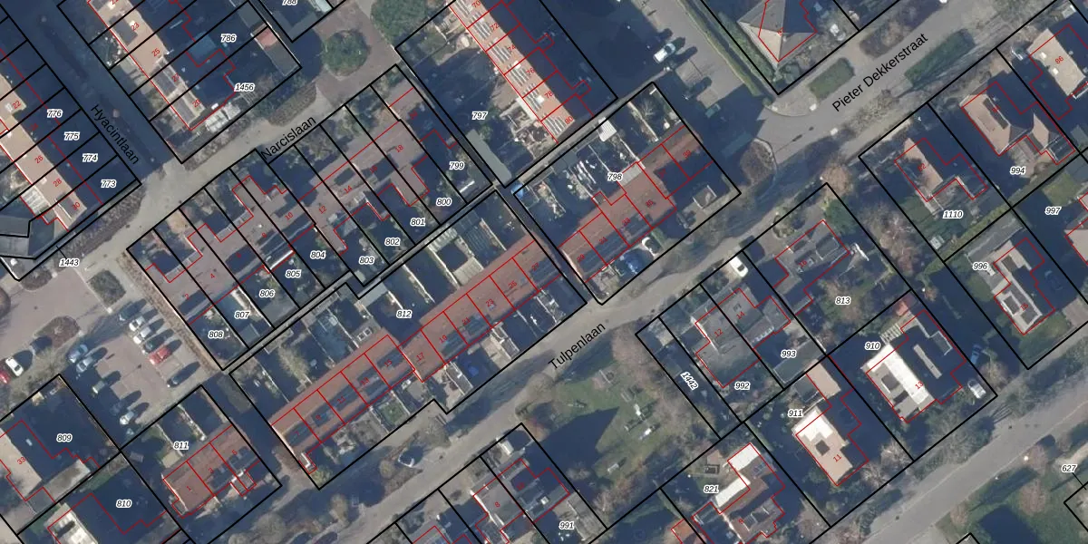 Het perceel waarop Tulpenlaan 27 staat heeft een oppervlakte van 1612 m². Dit is een zeer groot perceel. De perceeloppervlakte wordt geregistreerd door het Kadaster. Gedetailleerde informatie over de maten van dit perceel kunt u vinden in het rapport Kadastrale kaart met maatvoering van Tulpenlaan 27.