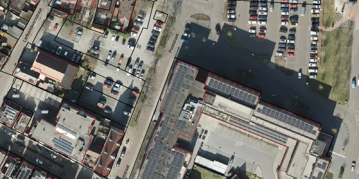 Het perceel waarop Poststraat 18 staat heeft een oppervlakte van 6385 m². Dit is een zeer groot perceel. De perceeloppervlakte wordt geregistreerd door het Kadaster. Gedetailleerde informatie over de maten van dit perceel kunt u vinden in het rapport Kadastrale kaart met maatvoering van Poststraat 18.