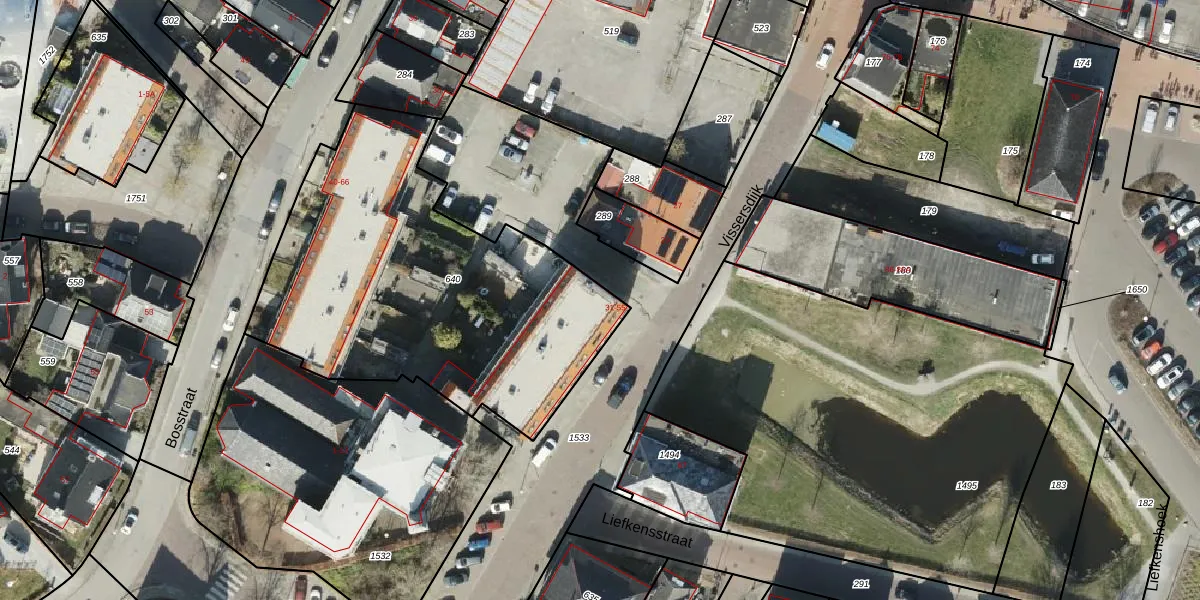 Het perceel waarop Vissersdijk 43 staat heeft een oppervlakte van 1854 m². Dit is een zeer groot perceel. De perceeloppervlakte wordt geregistreerd door het Kadaster. Gedetailleerde informatie over de maten van dit perceel kunt u vinden in het rapport Kadastrale kaart met maatvoering van Vissersdijk 43.