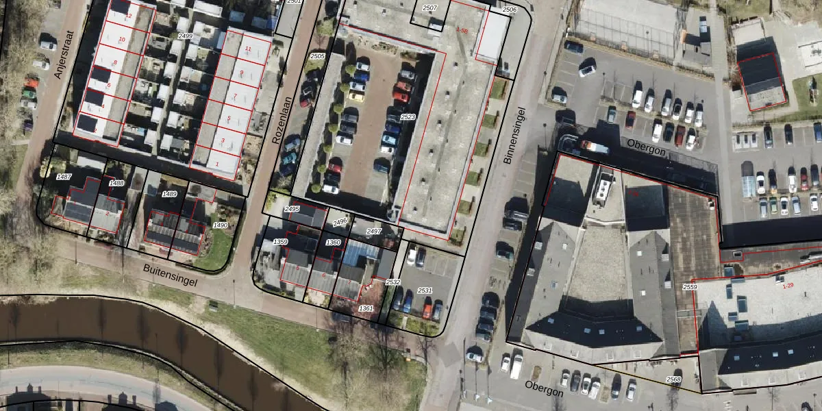 Het perceel waarop Binnensingel 3-B staat heeft een oppervlakte van 2485 m². Dit is een zeer groot perceel. De perceeloppervlakte wordt geregistreerd door het Kadaster. Gedetailleerde informatie over de maten van dit perceel kunt u vinden in het rapport Kadastrale kaart met maatvoering van Binnensingel 3-B.