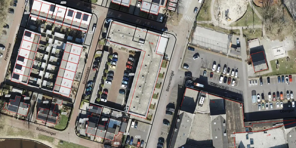 Het perceel waarop Binnensingel 9-A staat heeft een oppervlakte van 2485 m². Dit is een zeer groot perceel. De perceeloppervlakte wordt geregistreerd door het Kadaster. Gedetailleerde informatie over de maten van dit perceel kunt u vinden in het rapport Kadastrale kaart met maatvoering van Binnensingel 9-A.
