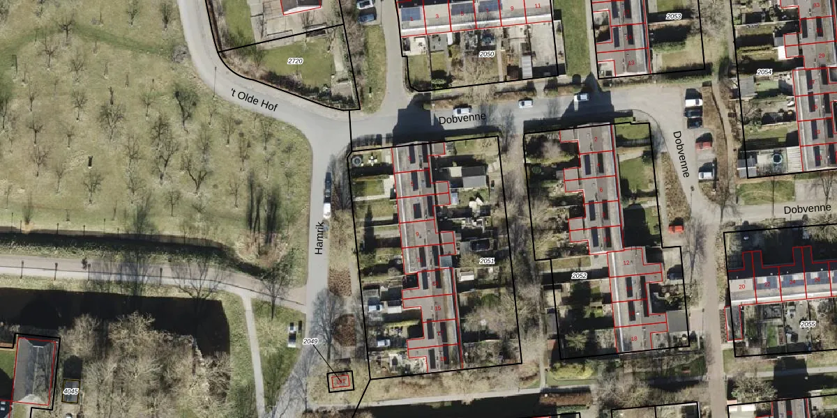 Het perceel waarop Hamrik 7 staat heeft een oppervlakte van 1985 m². Dit is een zeer groot perceel. De perceeloppervlakte wordt geregistreerd door het Kadaster. Gedetailleerde informatie over de maten van dit perceel kunt u vinden in het rapport Kadastrale kaart met maatvoering van Hamrik 7.