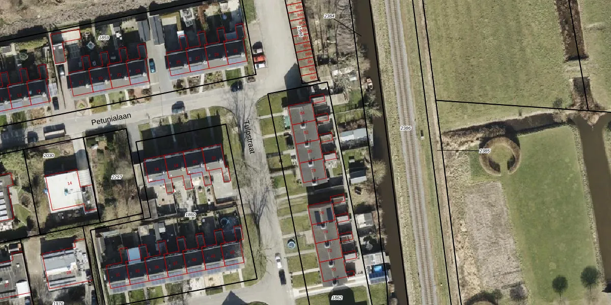 Het perceel waarop Tulpstraat 80 staat heeft een oppervlakte van 2057 m². Dit is een zeer groot perceel. De perceeloppervlakte wordt geregistreerd door het Kadaster. Gedetailleerde informatie over de maten van dit perceel kunt u vinden in het rapport Kadastrale kaart met maatvoering van Tulpstraat 80.