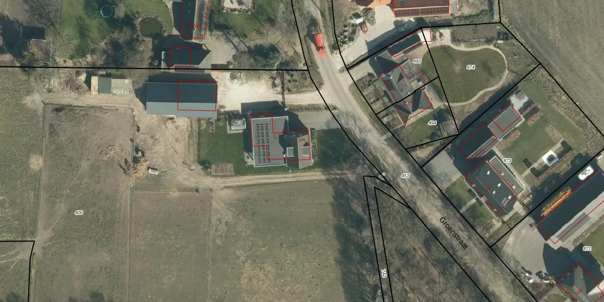 Het perceel waarop Groenstraat 10-A staat heeft een oppervlakte van 1,3 ha. Dit is een zeer groot perceel. De perceeloppervlakte wordt geregistreerd door het Kadaster. Gedetailleerde informatie over de maten van dit perceel kunt u vinden in het rapport Kadastrale kaart met maatvoering van Groenstraat 10-A.