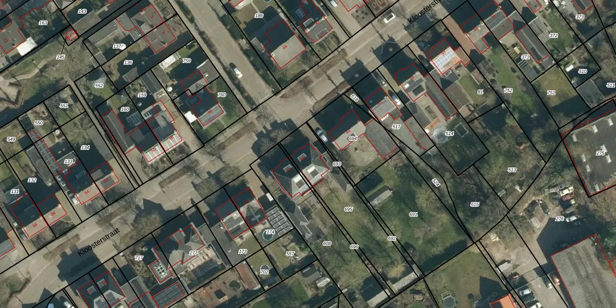 Kloosterstraat 45 is gelegen op kadastraal perceel VSM01H695. Deze kadastrale aanduiding is uniek en wordt gebruikt door het Kadaster om eigendomsrechten en andere zakelijke rechten vast te leggen. Het perceel maakt onderdeel uit van de kadastrale gemeente Vessem.