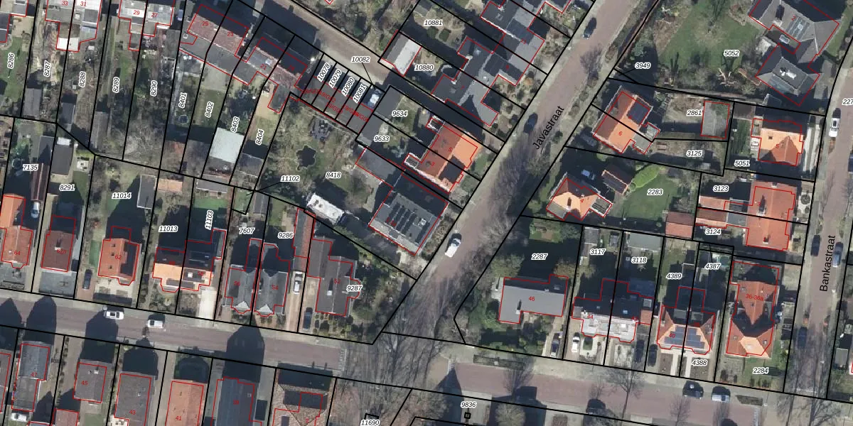 Het perceel waarop Javastraat 1-a staat heeft een oppervlakte van 994 m². Dit is een groot perceel. De perceeloppervlakte wordt geregistreerd door het Kadaster. Gedetailleerde informatie over de maten van dit perceel kunt u vinden in het rapport Kadastrale kaart met maatvoering van Javastraat 1-a.