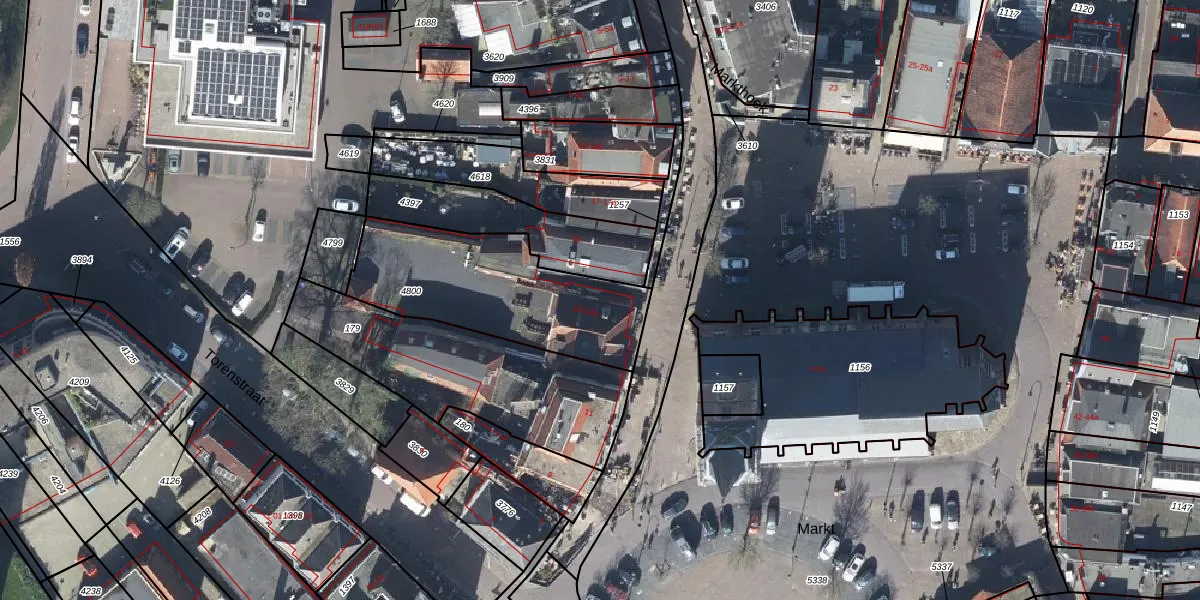 Het perceel waarop Markt 13 staat heeft een oppervlakte van 725 m². Dit is een groot perceel. De perceeloppervlakte wordt geregistreerd door het Kadaster. Gedetailleerde informatie over de maten van dit perceel kunt u vinden in het rapport Kadastrale kaart met maatvoering van Markt 13.