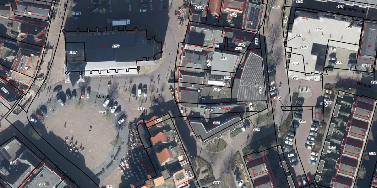 Het perceel waarop Markt 38 staat heeft een oppervlakte van 300 m². Dit is een groot perceel. De perceeloppervlakte wordt geregistreerd door het Kadaster. Gedetailleerde informatie over de maten van dit perceel kunt u vinden in het rapport Kadastrale kaart met maatvoering van Markt 38.