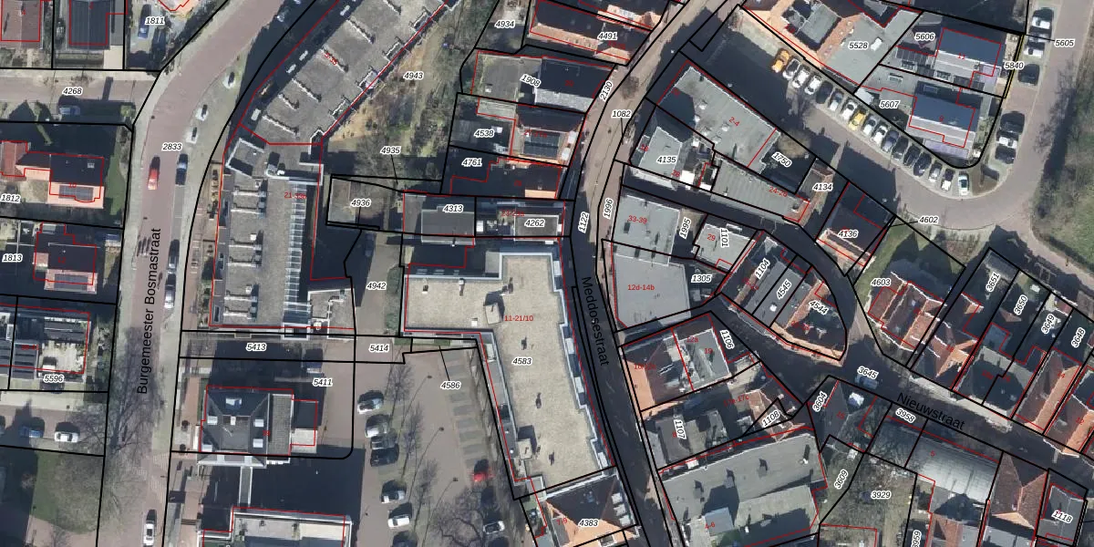 Het perceel waarop Meddosestraat 17 staat heeft een oppervlakte van 1106 m². Dit is een zeer groot perceel. De perceeloppervlakte wordt geregistreerd door het Kadaster. Gedetailleerde informatie over de maten van dit perceel kunt u vinden in het rapport Kadastrale kaart met maatvoering van Meddosestraat 17.