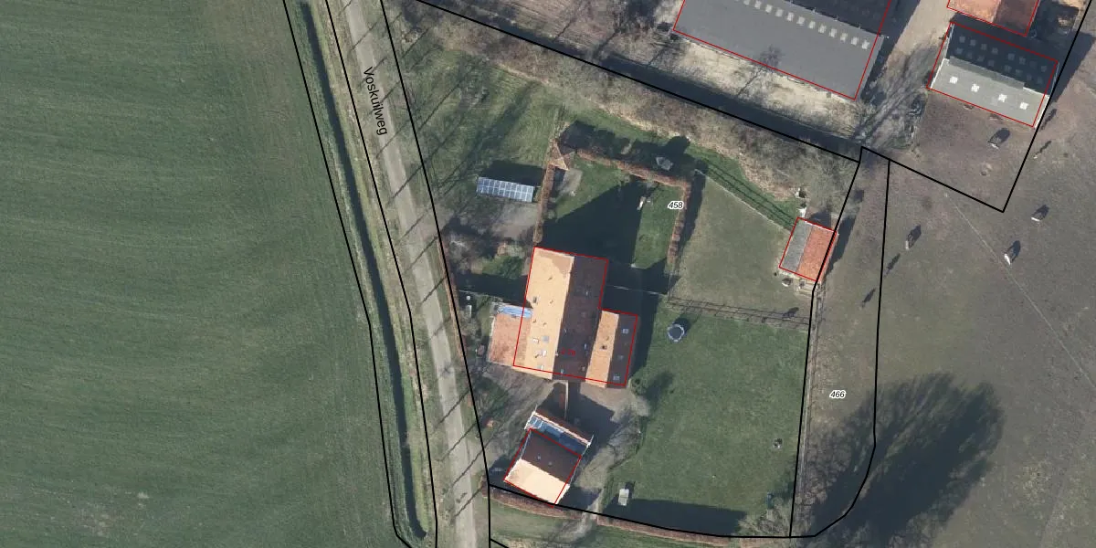 Het perceel waarop Voskuilweg 2 staat heeft een oppervlakte van 5500 m². Dit is een zeer groot perceel. De perceeloppervlakte wordt geregistreerd door het Kadaster. Gedetailleerde informatie over de maten van dit perceel kunt u vinden in het rapport Kadastrale kaart met maatvoering van Voskuilweg 2.