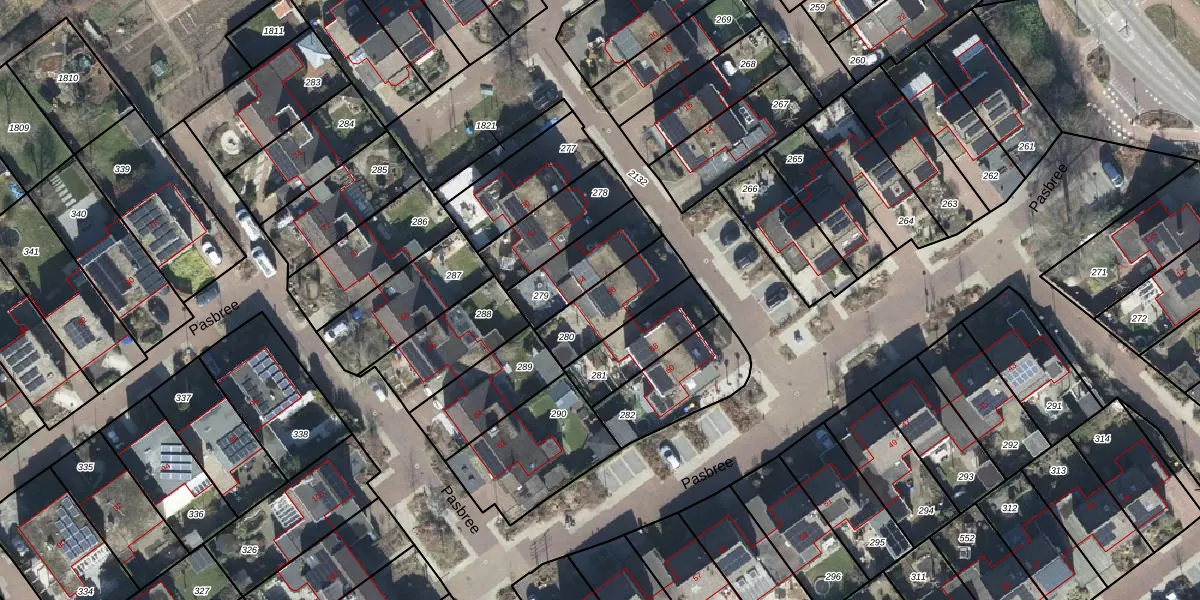 Het perceel waarop Pasbree 56 staat heeft een oppervlakte van 215 m². Dit is een middelgroot perceel. De perceeloppervlakte wordt geregistreerd door het Kadaster. Gedetailleerde informatie over de maten van dit perceel kunt u vinden in het rapport Kadastrale kaart met maatvoering van Pasbree 56.