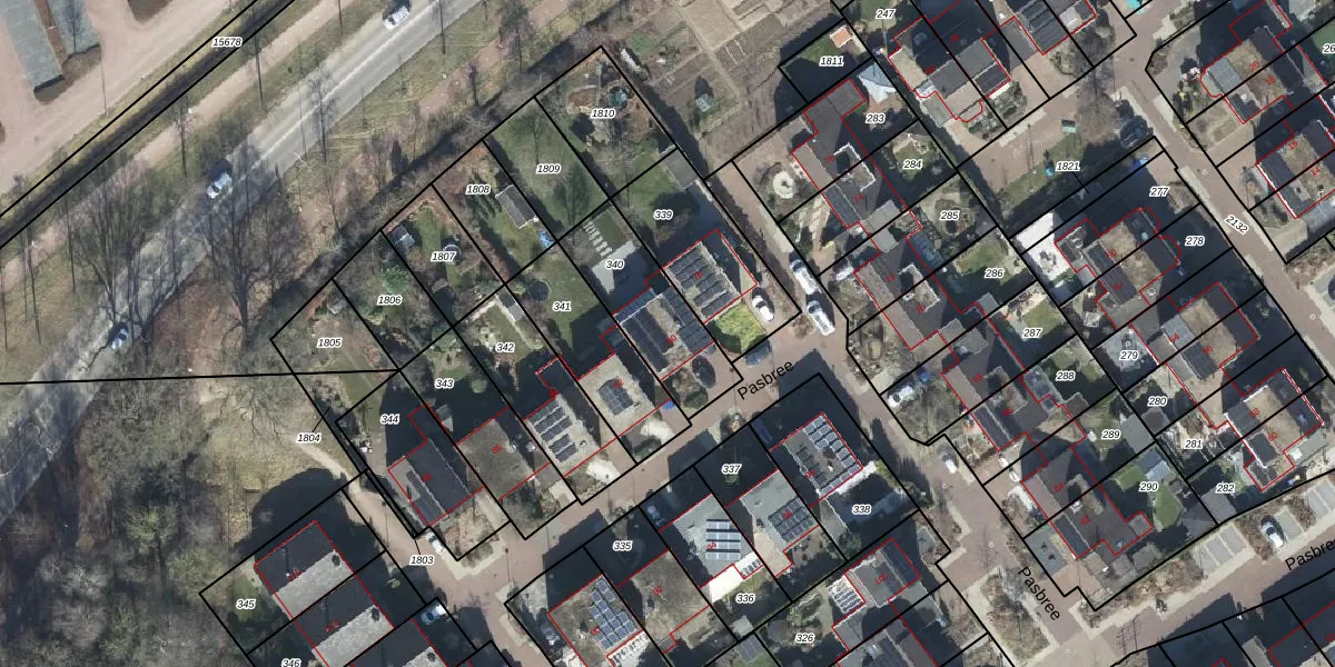Het perceel waarop Pasbree 80 staat heeft een oppervlakte van 343 m². Dit is een groot perceel. De perceeloppervlakte wordt geregistreerd door het Kadaster. Gedetailleerde informatie over de maten van dit perceel kunt u vinden in het rapport Kadastrale kaart met maatvoering van Pasbree 80.