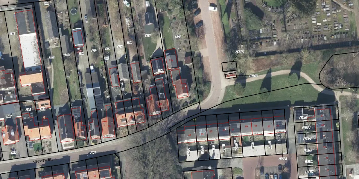 Het perceel waarop Vreesweg 25 staat heeft een oppervlakte van 1030 m². Dit is een zeer groot perceel. De perceeloppervlakte wordt geregistreerd door het Kadaster. Gedetailleerde informatie over de maten van dit perceel kunt u vinden in het rapport Kadastrale kaart met maatvoering van Vreesweg 25.