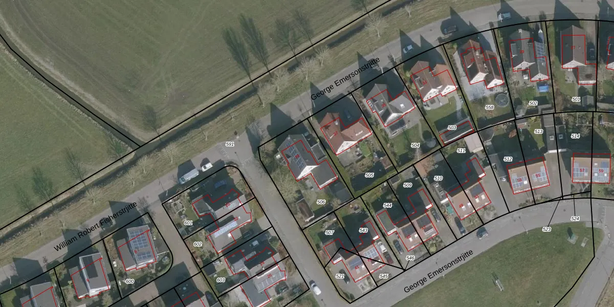 Het perceel waarop George Emersonstrjitte 39 staat heeft een oppervlakte van 607 m². Dit is een groot perceel. De perceeloppervlakte wordt geregistreerd door het Kadaster. Gedetailleerde informatie over de maten van dit perceel kunt u vinden in het rapport Kadastrale kaart met maatvoering van George Emersonstrjitte 39.