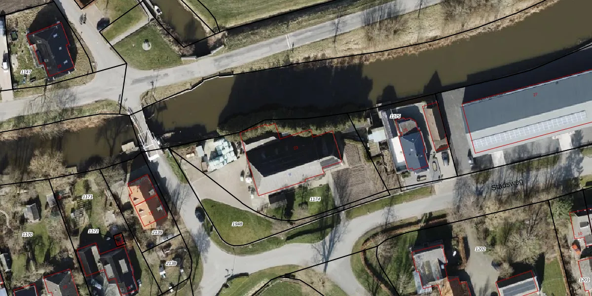 Het perceel waarop Stadsweg 23 staat heeft een oppervlakte van 1643 m². Dit is een zeer groot perceel. De perceeloppervlakte wordt geregistreerd door het Kadaster. Gedetailleerde informatie over de maten van dit perceel kunt u vinden in het rapport Kadastrale kaart met maatvoering van Stadsweg 23.