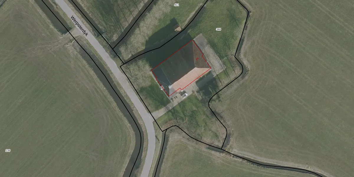 Het perceel waarop Werpsterdyk 24 staat heeft een oppervlakte van 3350 m². Dit is een zeer groot perceel. De perceeloppervlakte wordt geregistreerd door het Kadaster. Gedetailleerde informatie over de maten van dit perceel kunt u vinden in het rapport Kadastrale kaart met maatvoering van Werpsterdyk 24.