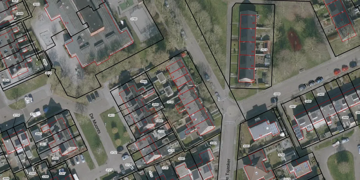Het perceel waarop De Tsjasker 12 staat heeft een oppervlakte van 1319 m². Dit is een zeer groot perceel. De perceeloppervlakte wordt geregistreerd door het Kadaster. Gedetailleerde informatie over de maten van dit perceel kunt u vinden in het rapport Kadastrale kaart met maatvoering van De Tsjasker 12.