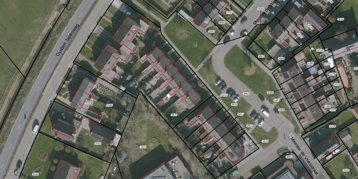 Meester de Vriesstraat 50 is gelegen op kadastraal perceel WMS03B3420. Deze kadastrale aanduiding is uniek en wordt gebruikt door het Kadaster om eigendomsrechten en andere zakelijke rechten vast te leggen. Het perceel maakt onderdeel uit van de kadastrale gemeente Witmarsum.