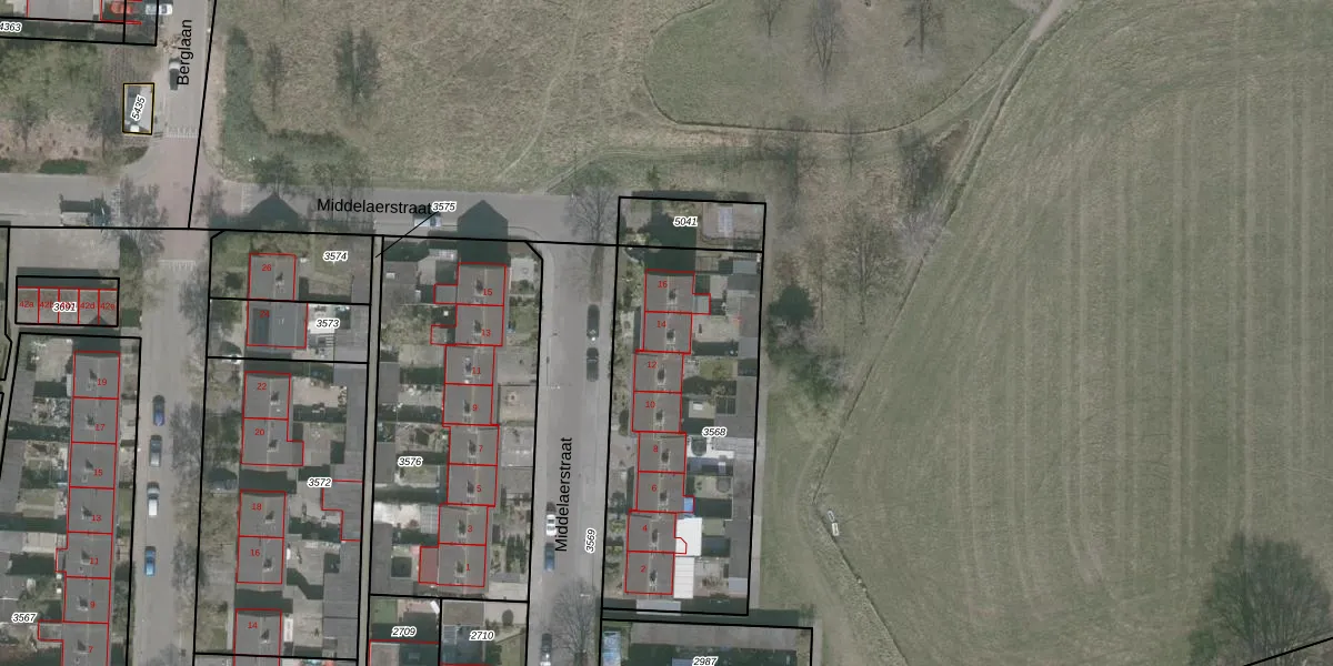 Middelaerstraat 14 is gelegen op kadastraal perceel WDT00G3568. Deze kadastrale aanduiding is uniek en wordt gebruikt door het Kadaster om eigendomsrechten en andere zakelijke rechten vast te leggen. Het perceel maakt onderdeel uit van de kadastrale gemeente Woensdrecht.