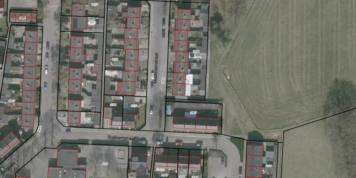 Het perceel waarop Middelaerstraat 2 staat heeft een oppervlakte van 1201 m². Dit is een zeer groot perceel. De perceeloppervlakte wordt geregistreerd door het Kadaster. Gedetailleerde informatie over de maten van dit perceel kunt u vinden in het rapport Kadastrale kaart met maatvoering van Middelaerstraat 2.