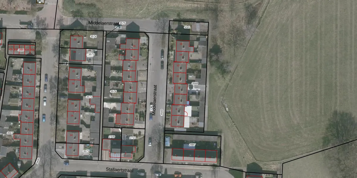Middelaerstraat 8 is gelegen op kadastraal perceel WDT00G3568. Deze kadastrale aanduiding is uniek en wordt gebruikt door het Kadaster om eigendomsrechten en andere zakelijke rechten vast te leggen. Het perceel maakt onderdeel uit van de kadastrale gemeente Woensdrecht.