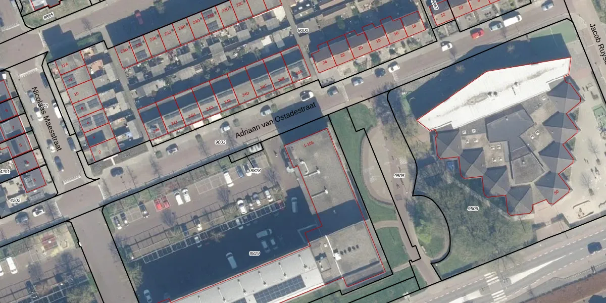 Adriaan van Ostadestraat 1 is gelegen op kadastraal perceel WDN01B8829. Deze kadastrale aanduiding is uniek en wordt gebruikt door het Kadaster om eigendomsrechten en andere zakelijke rechten vast te leggen. Het perceel maakt onderdeel uit van de kadastrale gemeente Woerden.