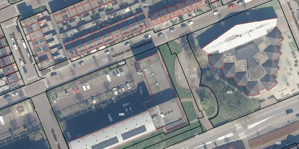 Het perceel waarop Adriaan van Ostadestraat 3 staat heeft een oppervlakte van 4462 m². Dit is een zeer groot perceel. De perceeloppervlakte wordt geregistreerd door het Kadaster. Gedetailleerde informatie over de maten van dit perceel kunt u vinden in het rapport Kadastrale kaart met maatvoering van Adriaan van Ostadestraat 3.