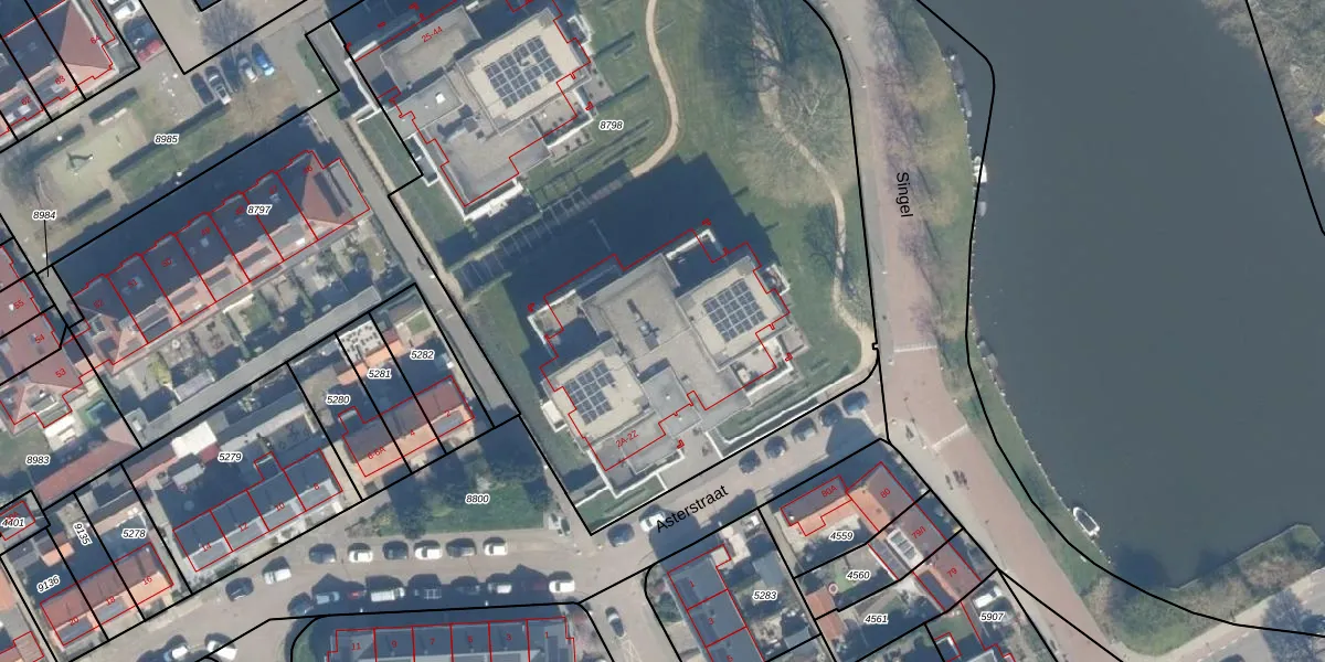 Het perceel waarop Asterstraat 2-V staat heeft een oppervlakte van 5244 m². Dit is een zeer groot perceel. De perceeloppervlakte wordt geregistreerd door het Kadaster. Gedetailleerde informatie over de maten van dit perceel kunt u vinden in het rapport Kadastrale kaart met maatvoering van Asterstraat 2-V.