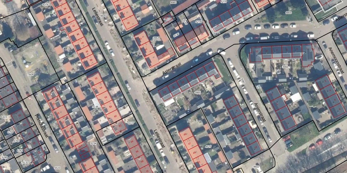 Het perceel waarop Asterstraat 21 staat heeft een oppervlakte van 2015 m². Dit is een zeer groot perceel. De perceeloppervlakte wordt geregistreerd door het Kadaster. Gedetailleerde informatie over de maten van dit perceel kunt u vinden in het rapport Kadastrale kaart met maatvoering van Asterstraat 21.