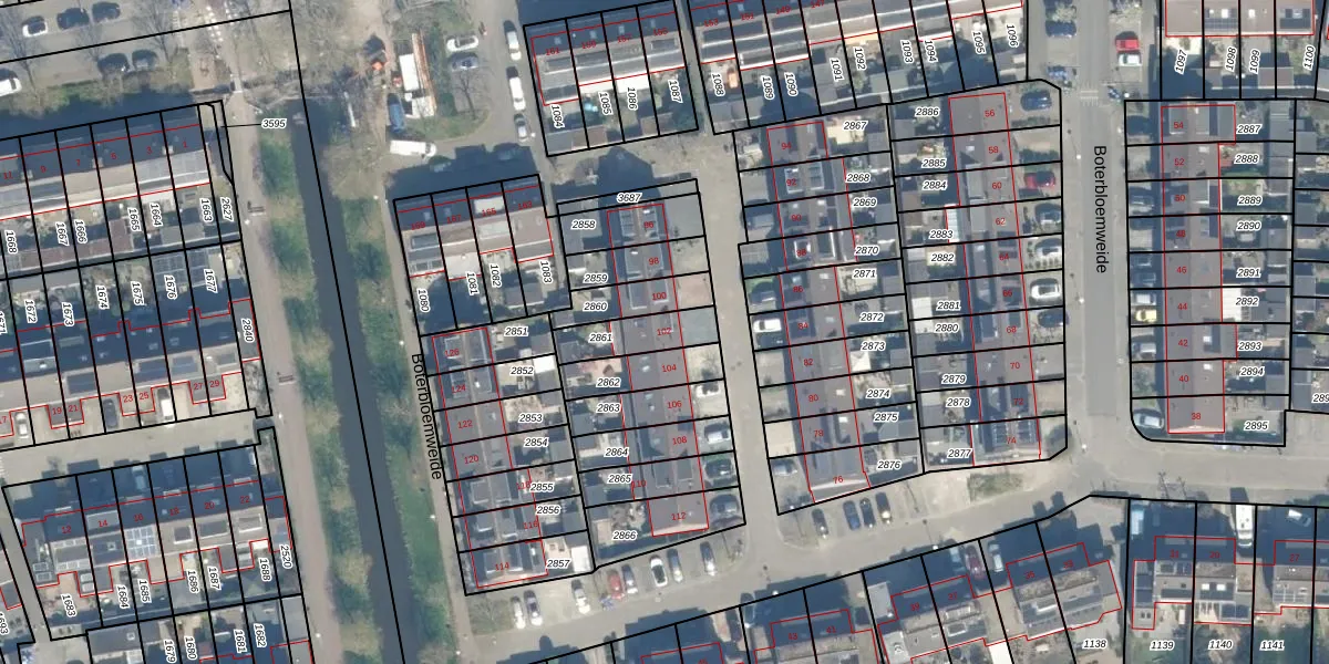 Boterbloemweide 102 is gelegen op kadastraal perceel WDN01D2861. Deze kadastrale aanduiding is uniek en wordt gebruikt door het Kadaster om eigendomsrechten en andere zakelijke rechten vast te leggen. Het perceel maakt onderdeel uit van de kadastrale gemeente Woerden.