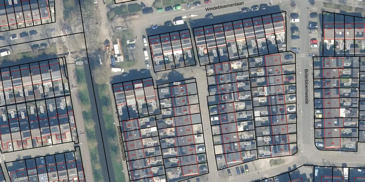 Boterbloemweide 96 is gelegen op kadastraal perceel WDN01D2858. Deze kadastrale aanduiding is uniek en wordt gebruikt door het Kadaster om eigendomsrechten en andere zakelijke rechten vast te leggen. Het perceel maakt onderdeel uit van de kadastrale gemeente Woerden.