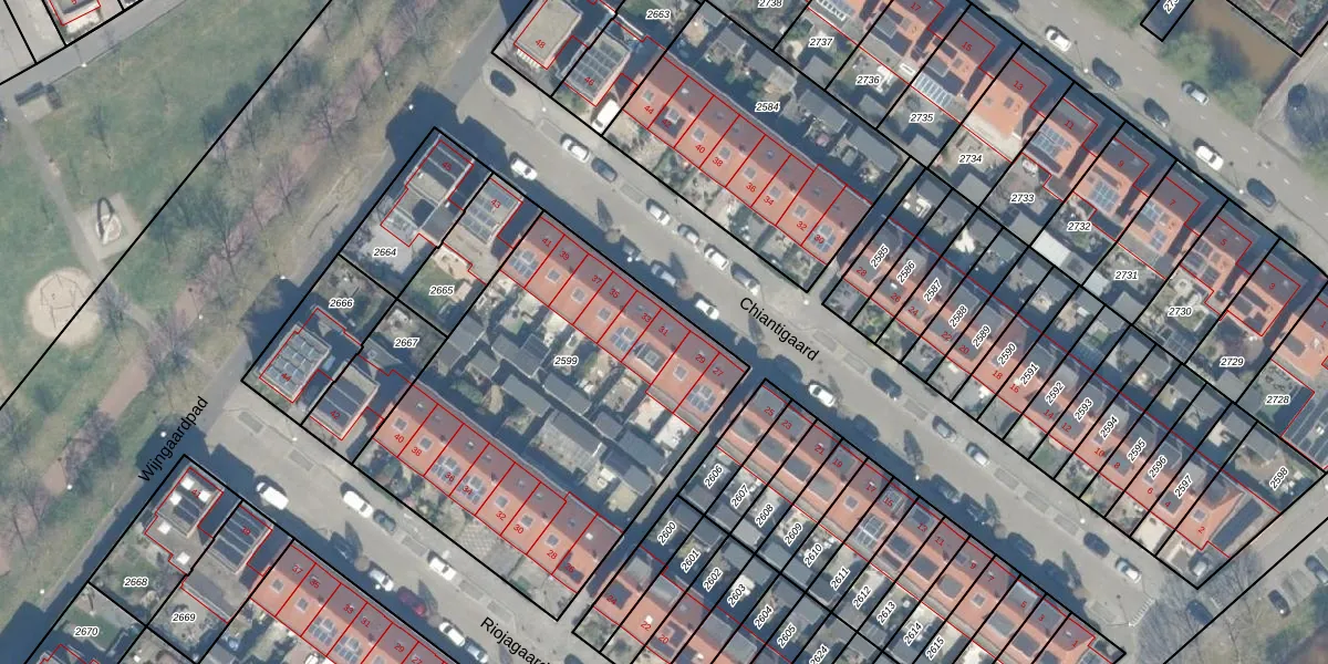 Het perceel waarop Chiantigaard 31 staat heeft een oppervlakte van 1865 m². Dit is een zeer groot perceel. De perceeloppervlakte wordt geregistreerd door het Kadaster. Gedetailleerde informatie over de maten van dit perceel kunt u vinden in het rapport Kadastrale kaart met maatvoering van Chiantigaard 31.