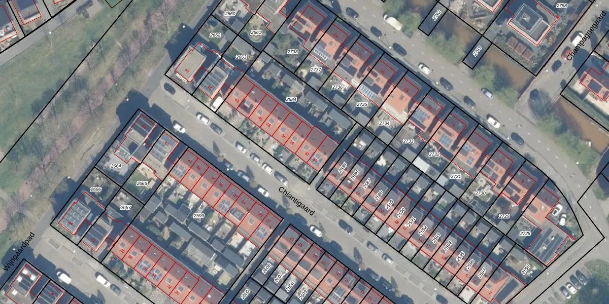 Het perceel waarop Chiantigaard 32 staat heeft een oppervlakte van 1000 m². Dit is een zeer groot perceel. De perceeloppervlakte wordt geregistreerd door het Kadaster. Gedetailleerde informatie over de maten van dit perceel kunt u vinden in het rapport Kadastrale kaart met maatvoering van Chiantigaard 32.
