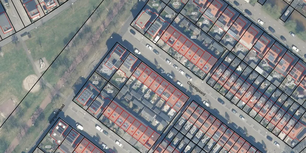 Het perceel waarop Chiantigaard 37 staat heeft een oppervlakte van 1865 m². Dit is een zeer groot perceel. De perceeloppervlakte wordt geregistreerd door het Kadaster. Gedetailleerde informatie over de maten van dit perceel kunt u vinden in het rapport Kadastrale kaart met maatvoering van Chiantigaard 37.
