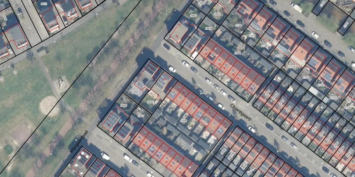 Het perceel waarop Chiantigaard 41 staat heeft een oppervlakte van 1865 m². Dit is een zeer groot perceel. De perceeloppervlakte wordt geregistreerd door het Kadaster. Gedetailleerde informatie over de maten van dit perceel kunt u vinden in het rapport Kadastrale kaart met maatvoering van Chiantigaard 41.