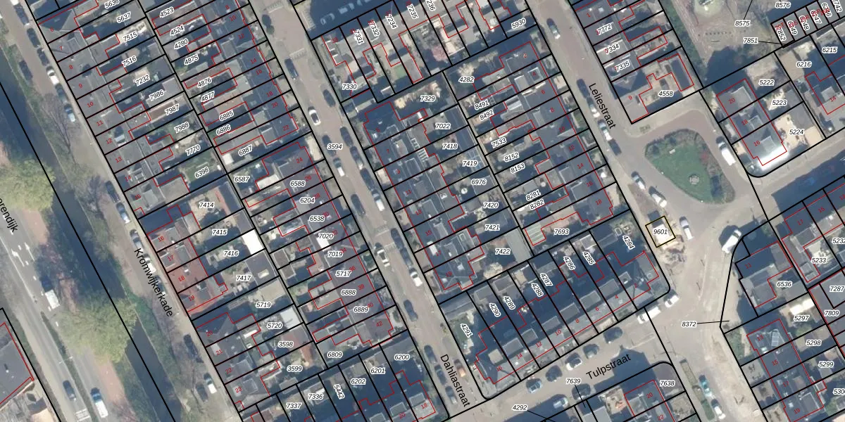Dahliastraat 13 is gelegen op kadastraal perceel WDN01B6976. Deze kadastrale aanduiding is uniek en wordt gebruikt door het Kadaster om eigendomsrechten en andere zakelijke rechten vast te leggen. Het perceel maakt onderdeel uit van de kadastrale gemeente Woerden.