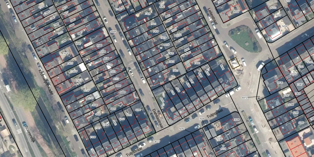 Dahliastraat 19 is gelegen op kadastraal perceel WDN01B7422. Deze kadastrale aanduiding is uniek en wordt gebruikt door het Kadaster om eigendomsrechten en andere zakelijke rechten vast te leggen. Het perceel maakt onderdeel uit van de kadastrale gemeente Woerden.