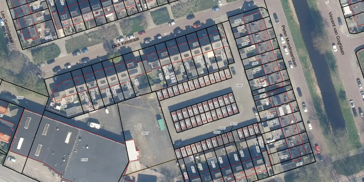 Het perceel waarop Dick Ketstraat 1-L staat heeft een oppervlakte van 18 m². Dit is een klein perceel. De perceeloppervlakte wordt geregistreerd door het Kadaster. Gedetailleerde informatie over de maten van dit perceel kunt u vinden in het rapport Kadastrale kaart met maatvoering van Dick Ketstraat 1-L.