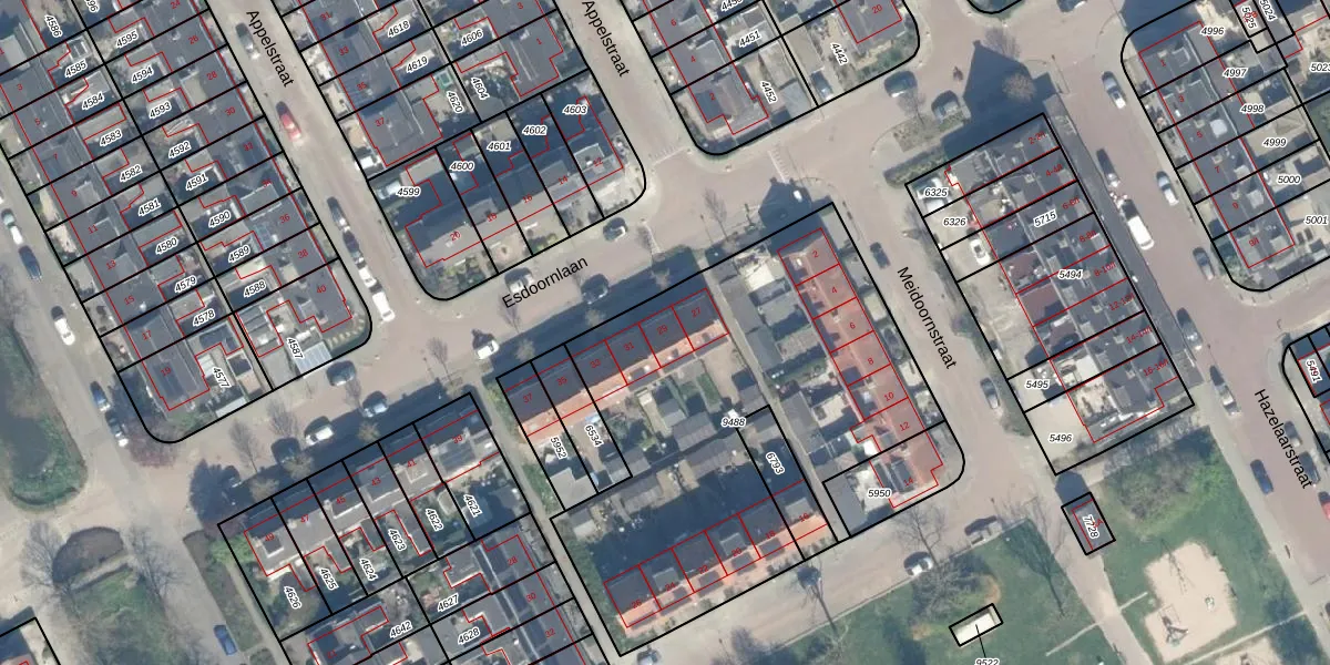 Esdoornlaan 29 is gelegen op kadastraal perceel WDN01B9488. Deze kadastrale aanduiding is uniek en wordt gebruikt door het Kadaster om eigendomsrechten en andere zakelijke rechten vast te leggen. Het perceel maakt onderdeel uit van de kadastrale gemeente Woerden.