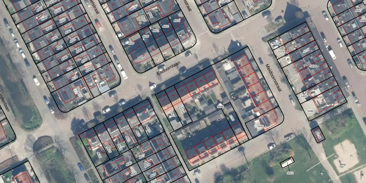 Esdoornlaan 33 is gelegen op kadastraal perceel WDN01B9488. Deze kadastrale aanduiding is uniek en wordt gebruikt door het Kadaster om eigendomsrechten en andere zakelijke rechten vast te leggen. Het perceel maakt onderdeel uit van de kadastrale gemeente Woerden.