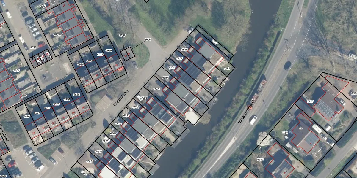 Essenlaan 13 is gelegen op kadastraal perceel WDN01B6957. Deze kadastrale aanduiding is uniek en wordt gebruikt door het Kadaster om eigendomsrechten en andere zakelijke rechten vast te leggen. Het perceel maakt onderdeel uit van de kadastrale gemeente Woerden.