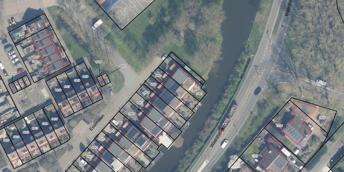 Essenlaan 7 is gelegen op kadastraal perceel WDN01B6960. Deze kadastrale aanduiding is uniek en wordt gebruikt door het Kadaster om eigendomsrechten en andere zakelijke rechten vast te leggen. Het perceel maakt onderdeel uit van de kadastrale gemeente Woerden.