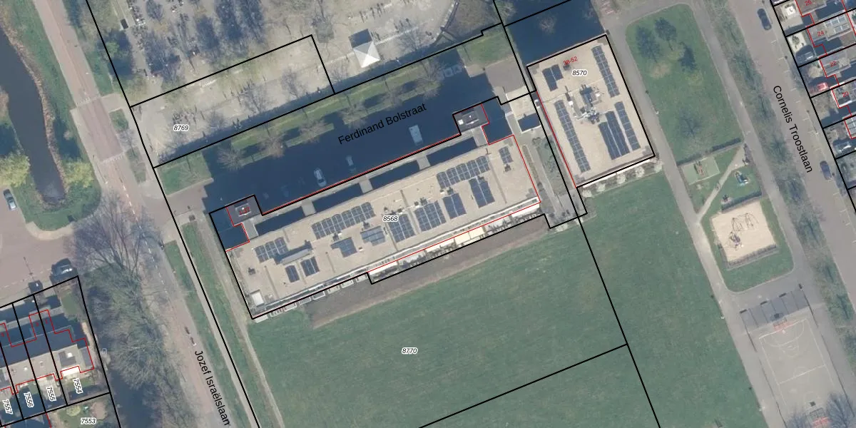 Het perceel waarop Ferdinand Bolstraat 27 staat heeft een oppervlakte van 2030 m². Dit is een zeer groot perceel. De perceeloppervlakte wordt geregistreerd door het Kadaster. Gedetailleerde informatie over de maten van dit perceel kunt u vinden in het rapport Kadastrale kaart met maatvoering van Ferdinand Bolstraat 27.