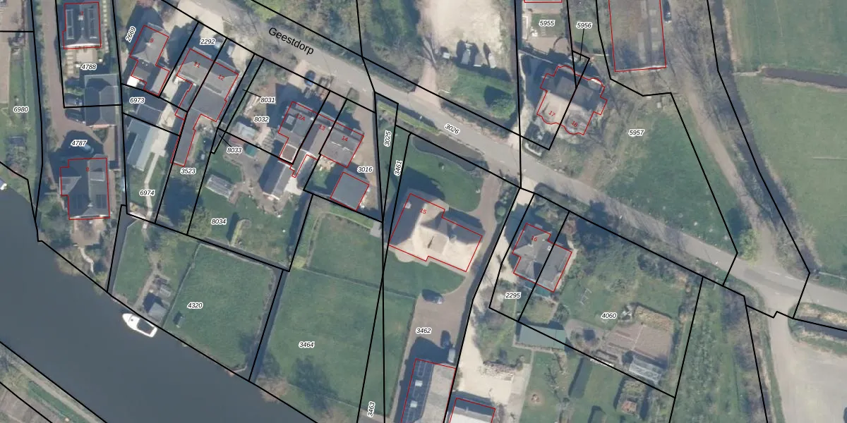 Geestdorp 15 is gelegen op kadastraal perceel WDN01A3462. Deze kadastrale aanduiding is uniek en wordt gebruikt door het Kadaster om eigendomsrechten en andere zakelijke rechten vast te leggen. Het perceel maakt onderdeel uit van de kadastrale gemeente Woerden.