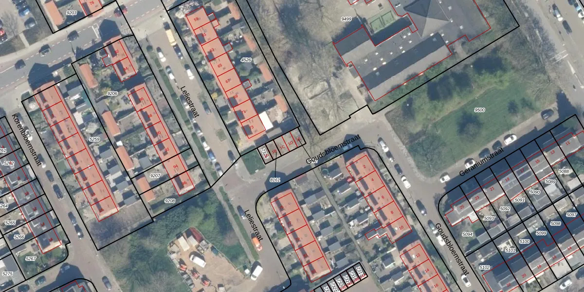Het perceel waarop Goudsbloemstraat 1-D staat heeft een oppervlakte van 59 m². Dit is een klein perceel. De perceeloppervlakte wordt geregistreerd door het Kadaster. Gedetailleerde informatie over de maten van dit perceel kunt u vinden in het rapport Kadastrale kaart met maatvoering van Goudsbloemstraat 1-D.
